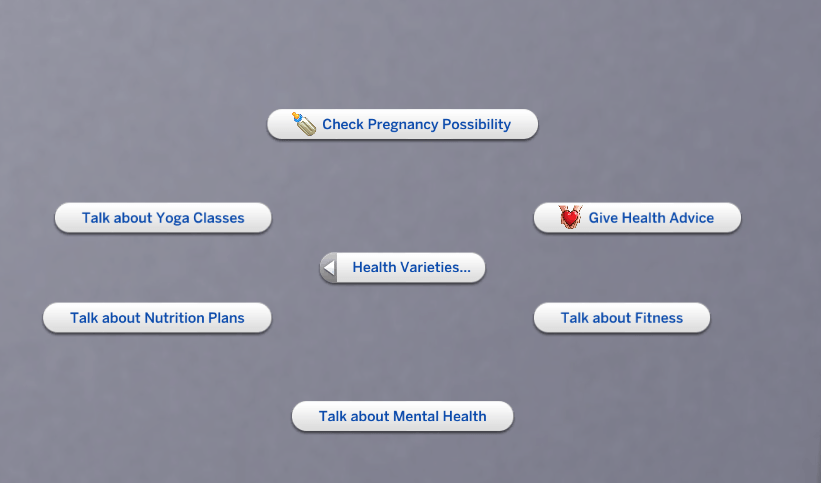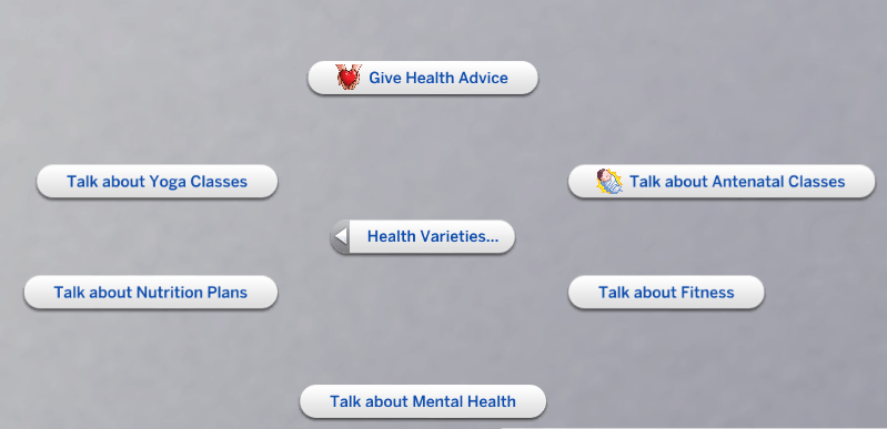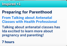 - Talk about Antenatal classes - This will only appear if the medical professional is interacting with a sim who is pregnant, and knows they are pregnant, this will then grant the pregnant sim a buff