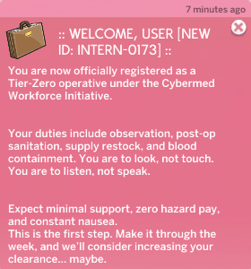 You clean up after failed mods and scavenge useful tech from discarded parts. Learn fast or get reassigned… permanently. Welcome to the back end of biohacking, you're elbow-deep in trash tech and failed enhancements, harvesting scrap and salvaging synthware before it sparks or explodes.